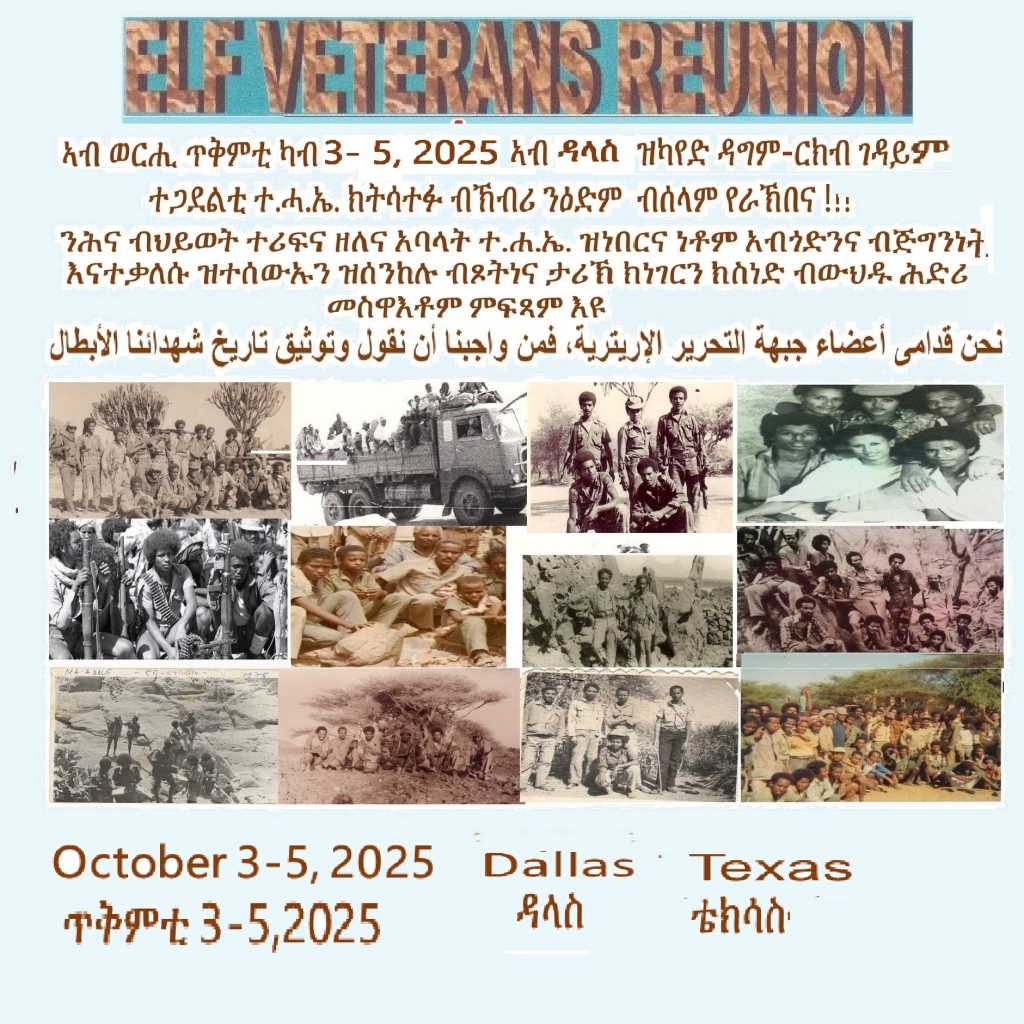 United Eritrea Media መጸዋዕታ ንኹሉ ግዱስ ኤርትራዊ ን ጥቅምቲ 3-5,2025 ዳግም ርክብ ገዳይም ተጋደልቲ ተሐኤ ብኽብሪ ይዕድሙኩም 10/3/2025 Written by Administrator. Date of post: May 30, 2025May 30, 2025. Leave a comment